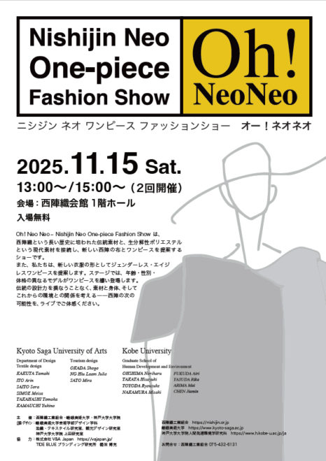西陣織工業組合と本学染織テキスタイル領域、観光デザイン領域と、神戸大学大学院との協働事業でファッションショー「Oh! Neo Neo ‒ Nishijin Neo One-piece Fashion Show」を西陣織会館(京都)で開催します。(11/15)